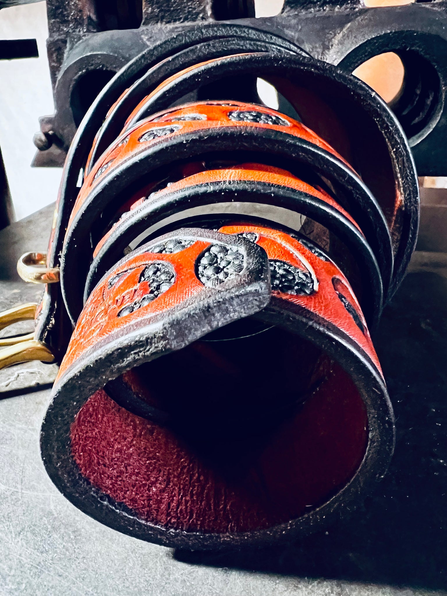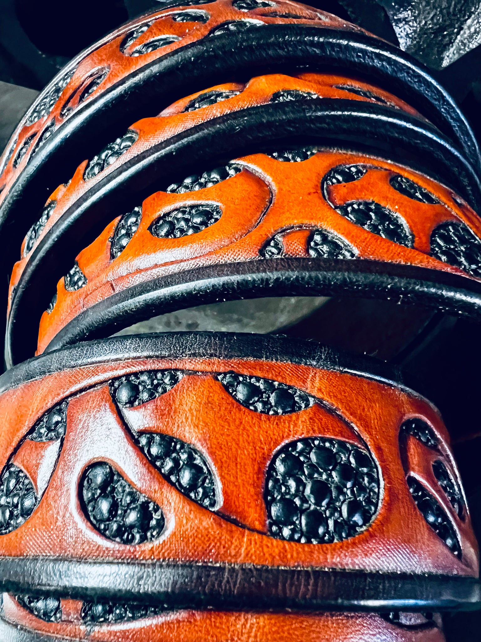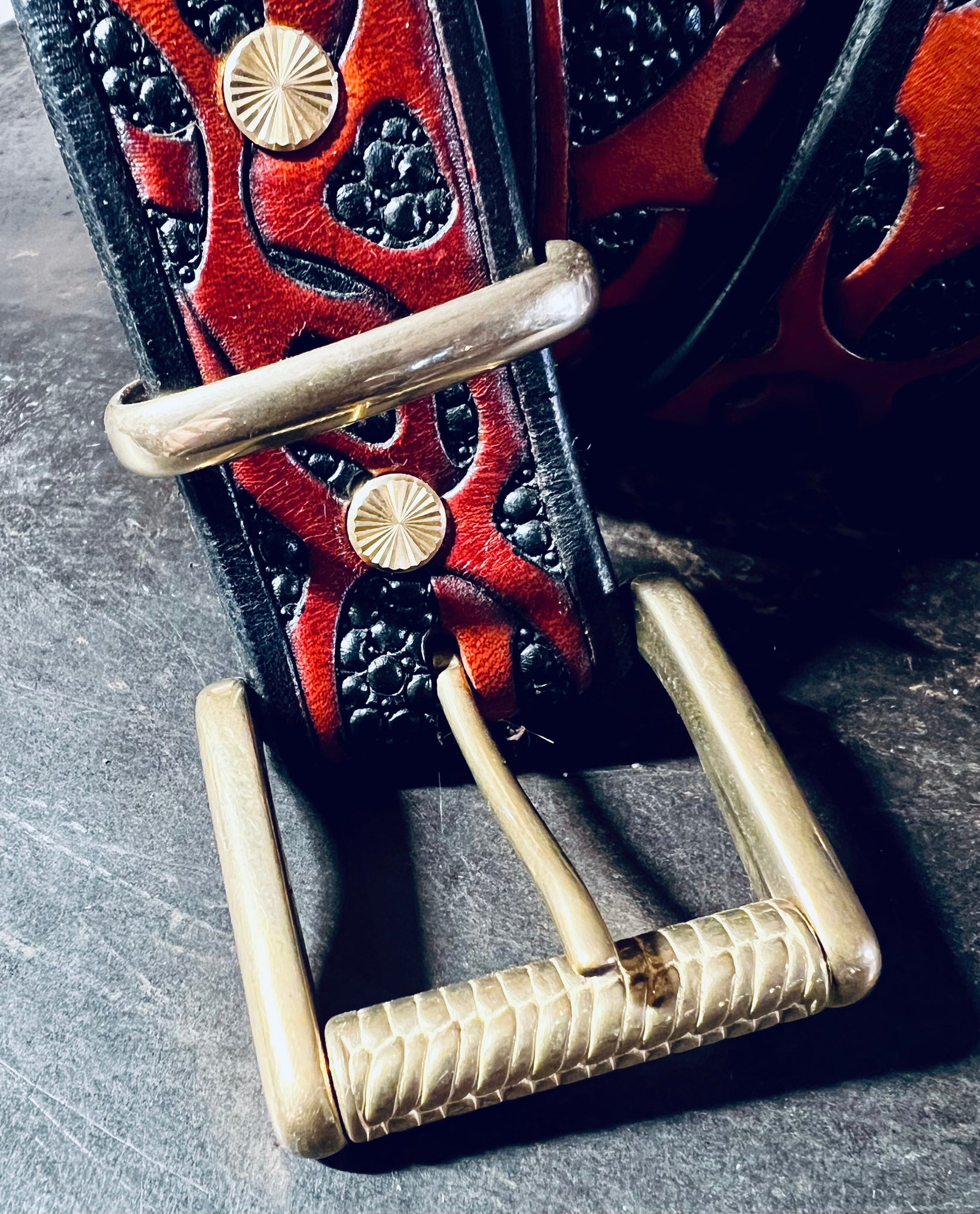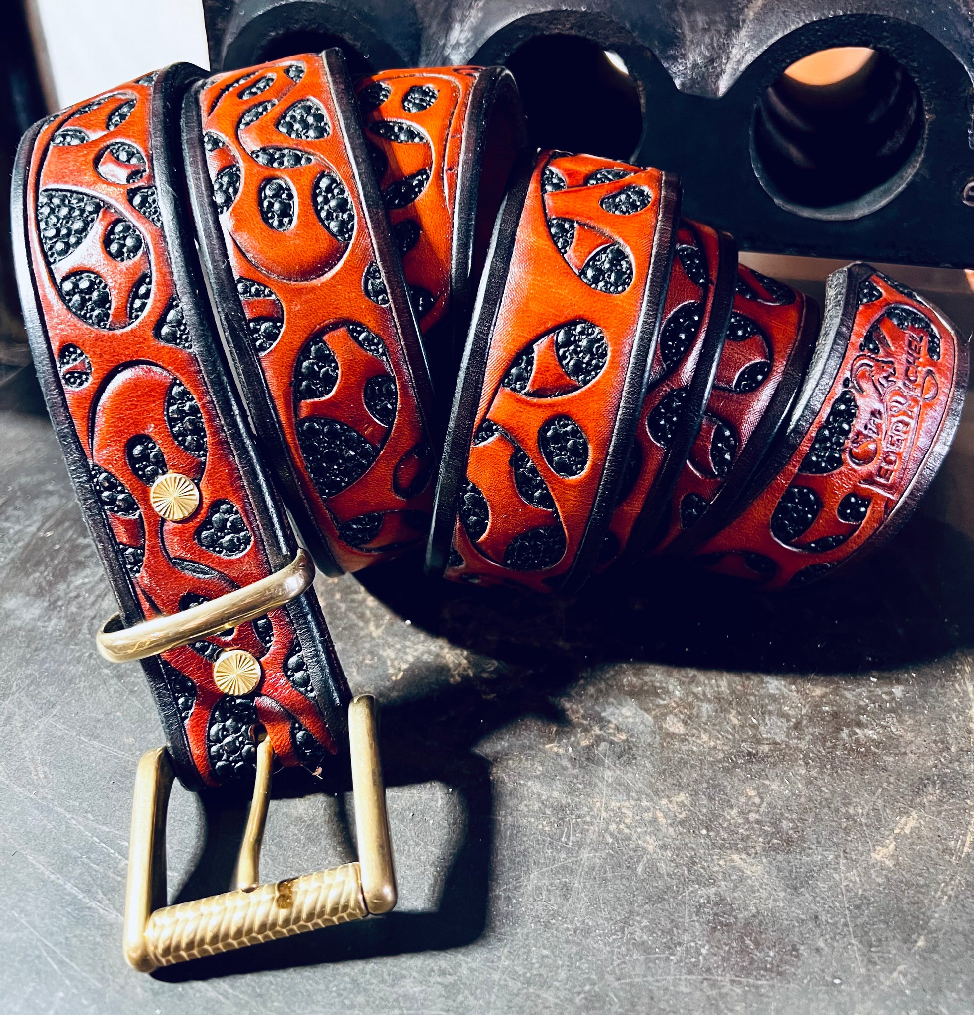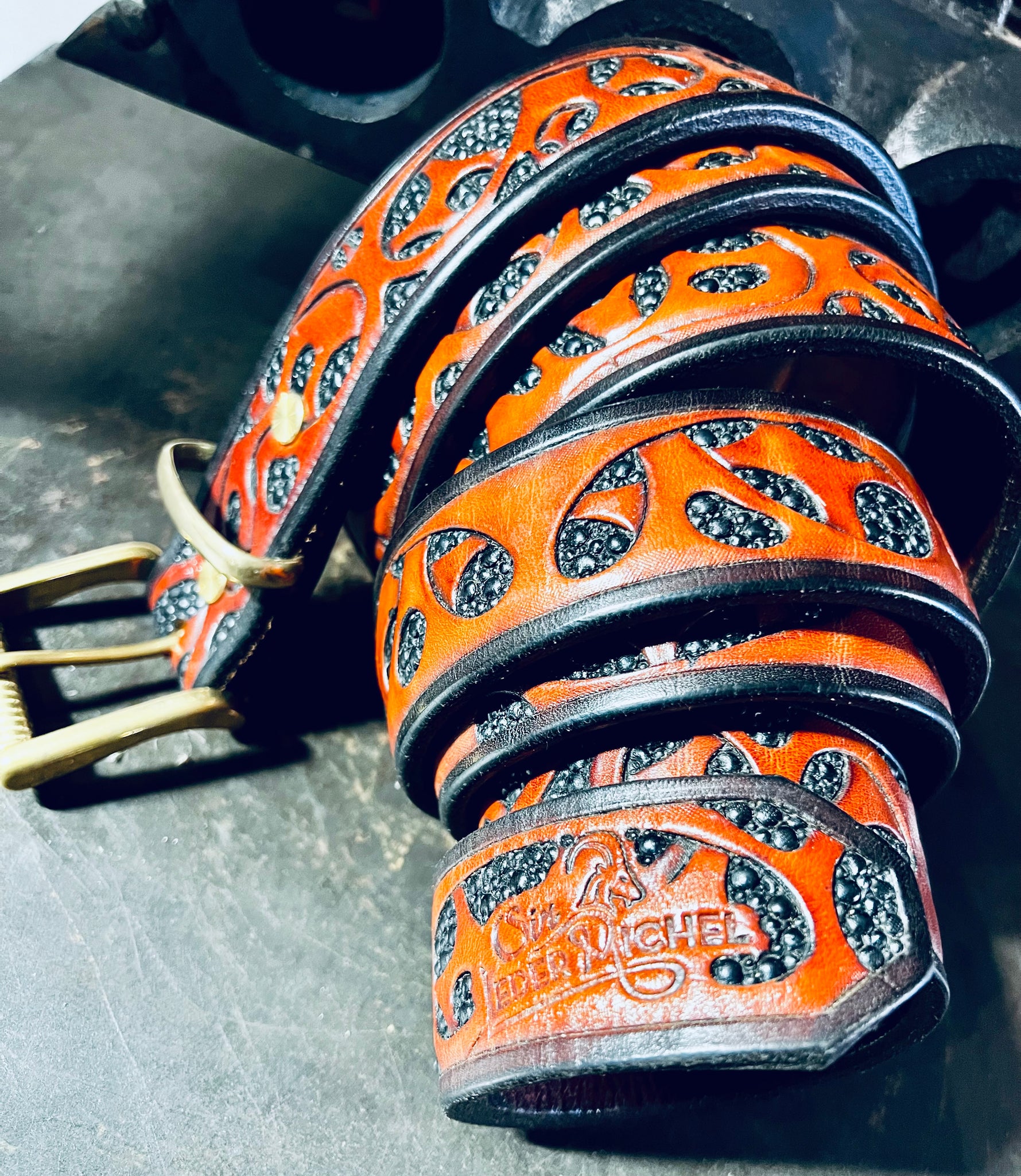 Die "THE GIANT" Variante mit über 6mm Lederstärke wurde komplett aufwändig von Hand punziert (ähnlich wie mit Hammer und Meißel)anschließend bemalt und gefärbt. Jede Bubble in diesem Gürtelriemen ist ein Hammerschlag.