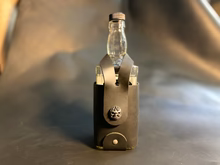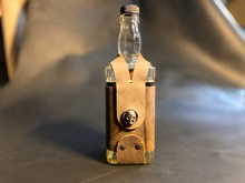 Handgefertigter und aus hochwertigem Rind-Leder hergestellter Flaschenhalter mit Druckknopfverschluss.