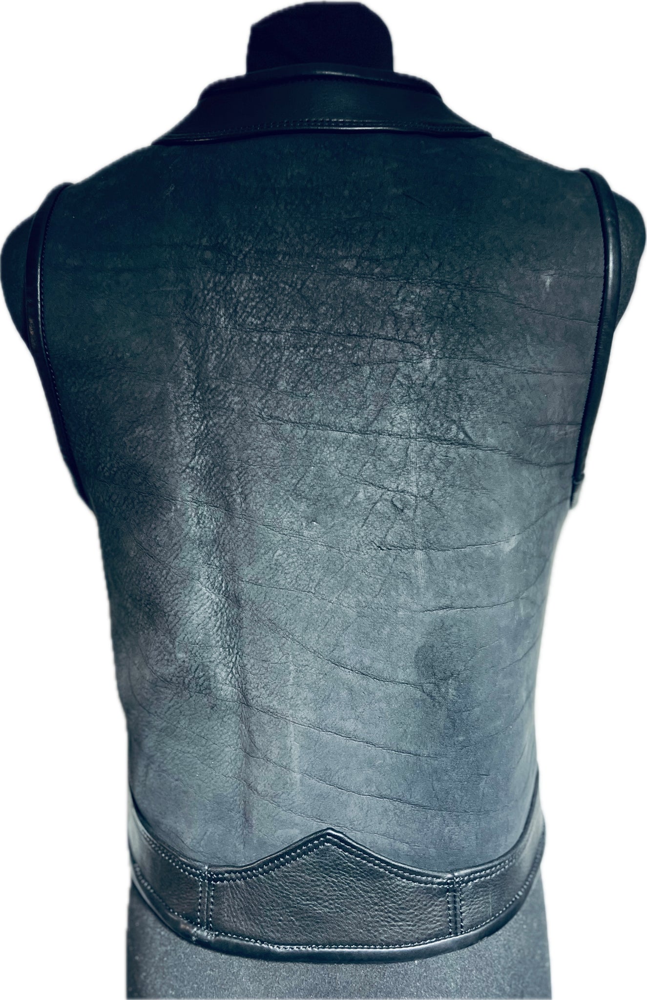 Handgefertigte Lederweste / Ledergilet aus 5mm starkem aber softem schwarzen Wasserbüffelleder mit natürlicher Narbenstruktur.