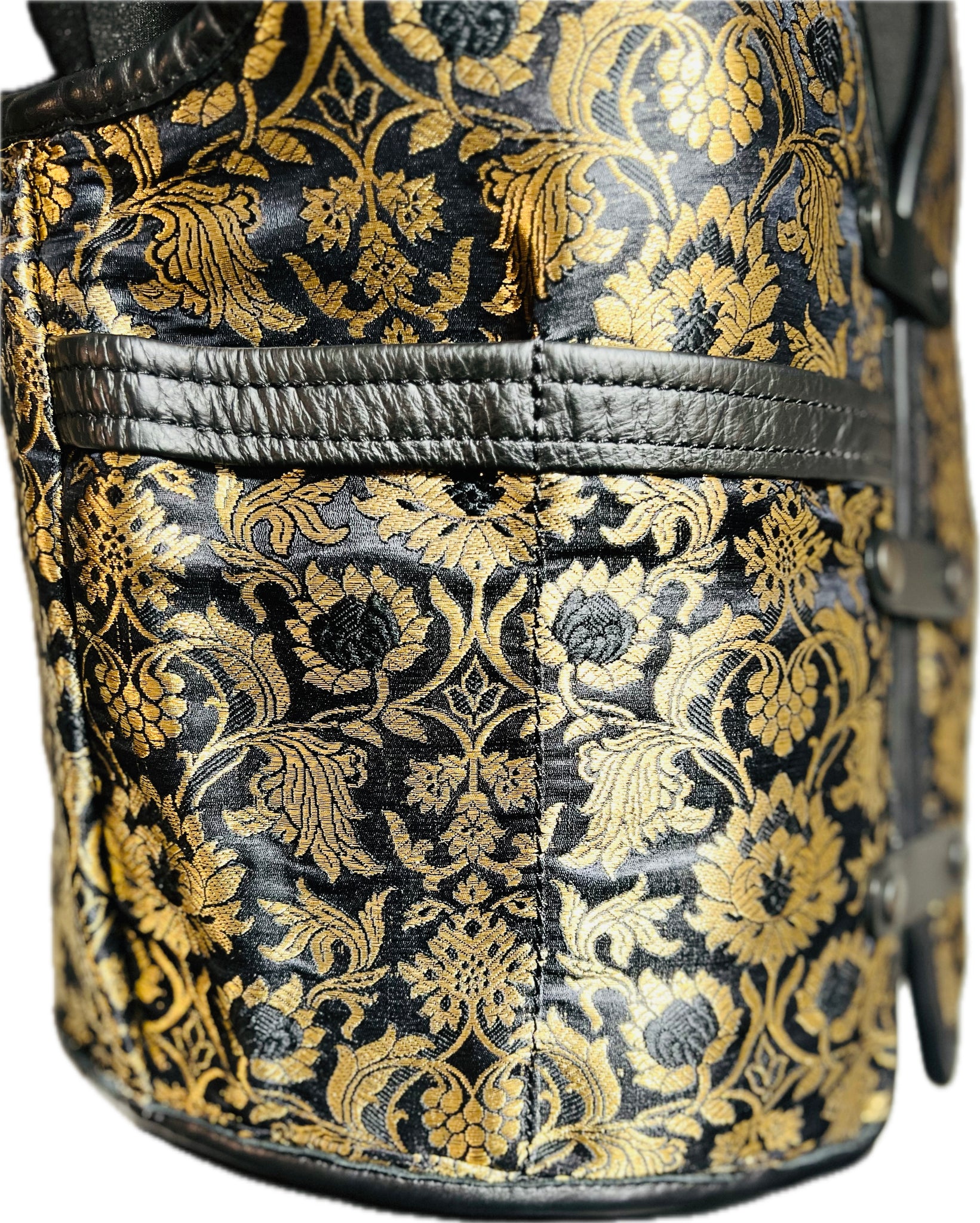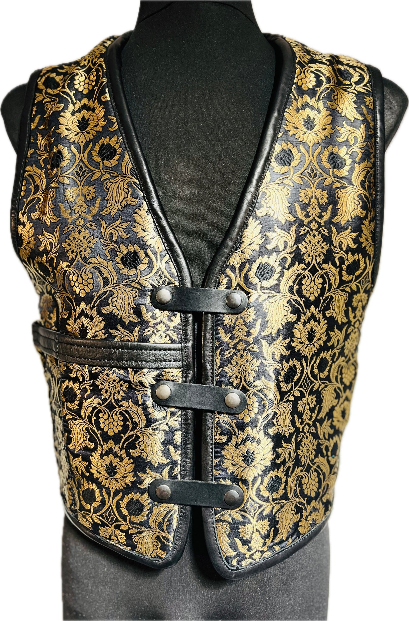 Rundum laufende Applikationen aus Sattelsitzleder. Innen verfugt dieses Einzelstück über einen Brokatinnenstoff mit 2 großen seitlichen Taschen. Außen steht eine Taschen zur Verfügung. Verschlossen wird diese West mittels abnehmbaren stabilen Druckknöpfen. Sechs Dollarcoins "Eagle" zieren dieses parchtstück. Die Einfassung besteht aus Pferdeleder.